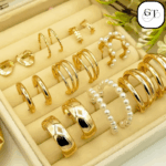 This luxurious collection features a variety of hoop and stud styles, all finished in a brilliant, rich gold tone, presented neatly in a plush, compartmentalized jewelry box. Perfect for those who love to switch up their look, this set offers both classic elegance and contemporary flair.
