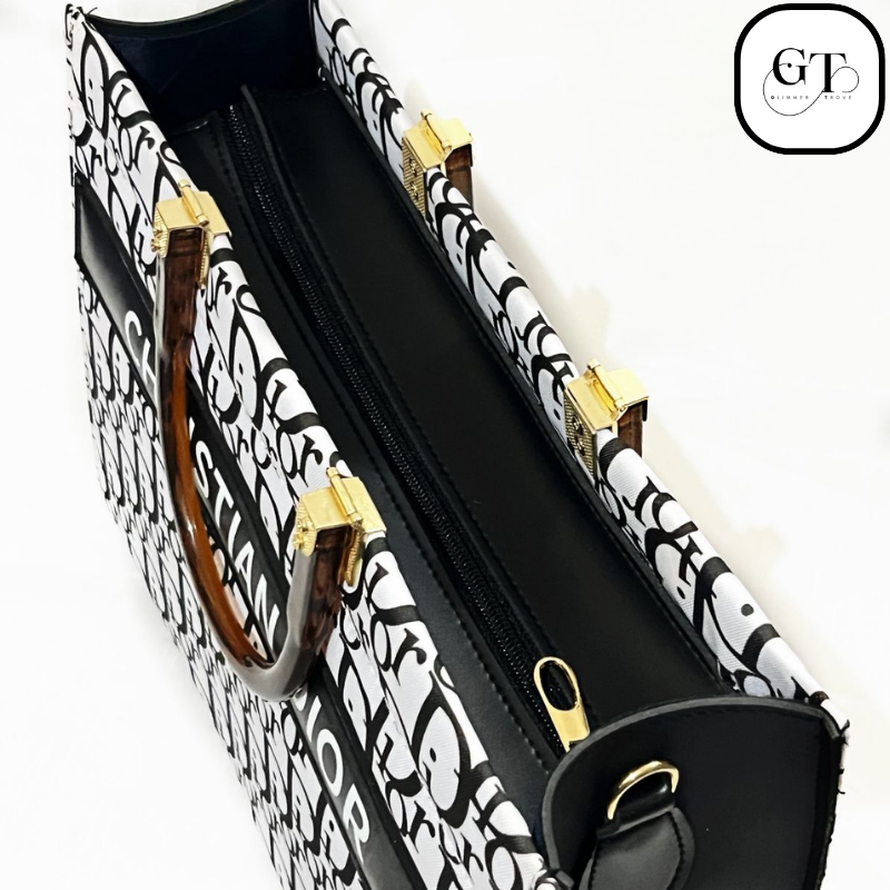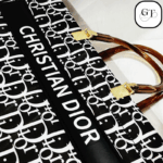 - Design & Color: This bag is available in 2 colors—a classic Black Monogram on a white base and a reverse White Monogram on a black base. Both feature a contrasting central band with the bold “CHRISTIAN DIOR” text printed across the front.