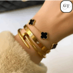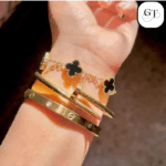 - Black Clover Charm Bracelet: A delicate chain bracelet featuring elegant black, enamel-filled four-leaf clover charms that dangle beautifully, interspersed with small crystal accents and a charming tassel detail.