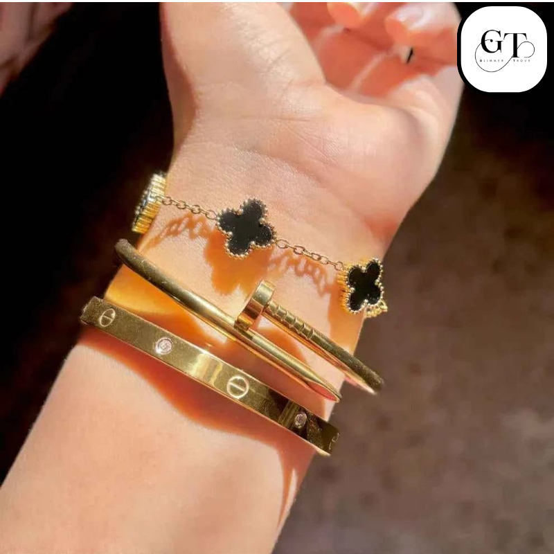 - Embellished Cuff/Bangle: A wide, smooth bangle featuring a mix of decorative motifs, including crystal accents and screw-head or simple letter engravings, offering a sophisticated, designer-inspired feel.