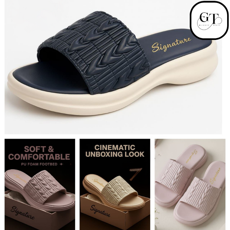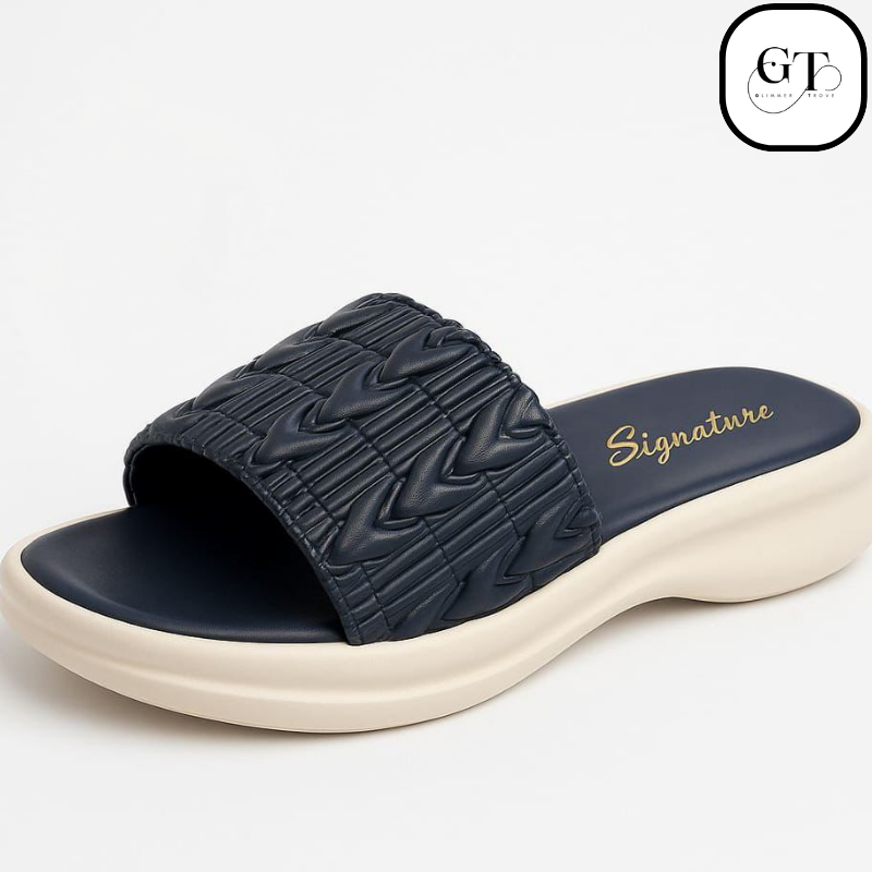 - Stylish & Trendy: The slide features a chic, quilted or woven-textured upper strap in a dark, sophisticated color (Navy Blue, as pictured), contrasting beautifully with the light, thick sole.