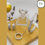 - Stud Earrings (Pair): Matching small stud earrings featuring the signature linked pattern and a crown design, with one showing a small, delicate jewel accent for a hint of sparkle.