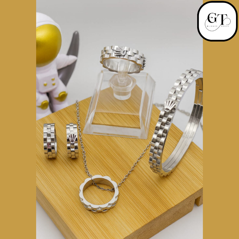 - Statement Ring: A bold, wide band featuring the distinct linked pattern and an embossed crown emblem at the center. Perfect as a standalone statement piece.