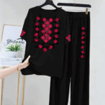 This striking ensemble features a bold, oversized t-shirt paired with comfortable, relaxed-fit trousers, both adorned with beautiful embroidery-style prints.