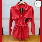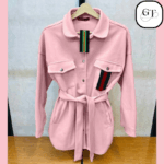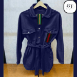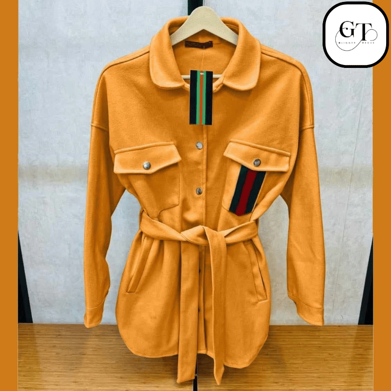 - Style: Features a classic collar, snap-button closure, and a stylish belted waist to define your silhouette. The design includes twin chest pockets with flaps and a subtle accent stripe (resembling Gucci’s iconic web) on one pocket, adding a touch of designer flair.